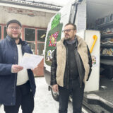 Eero Kääriäinen (oik.) esitteli Kiuruveden kaupunginjohtaja Juha-Pekka Rusaselle pakettiautoa, josta hän teki Vieremän kunnalle liikennöivän monipalvelu- ja kirjastoauton muutama vuosi sitten. Auton teippaukset ovat sarjakuvataiteilija Jyrki Nissisen käsialaa.
