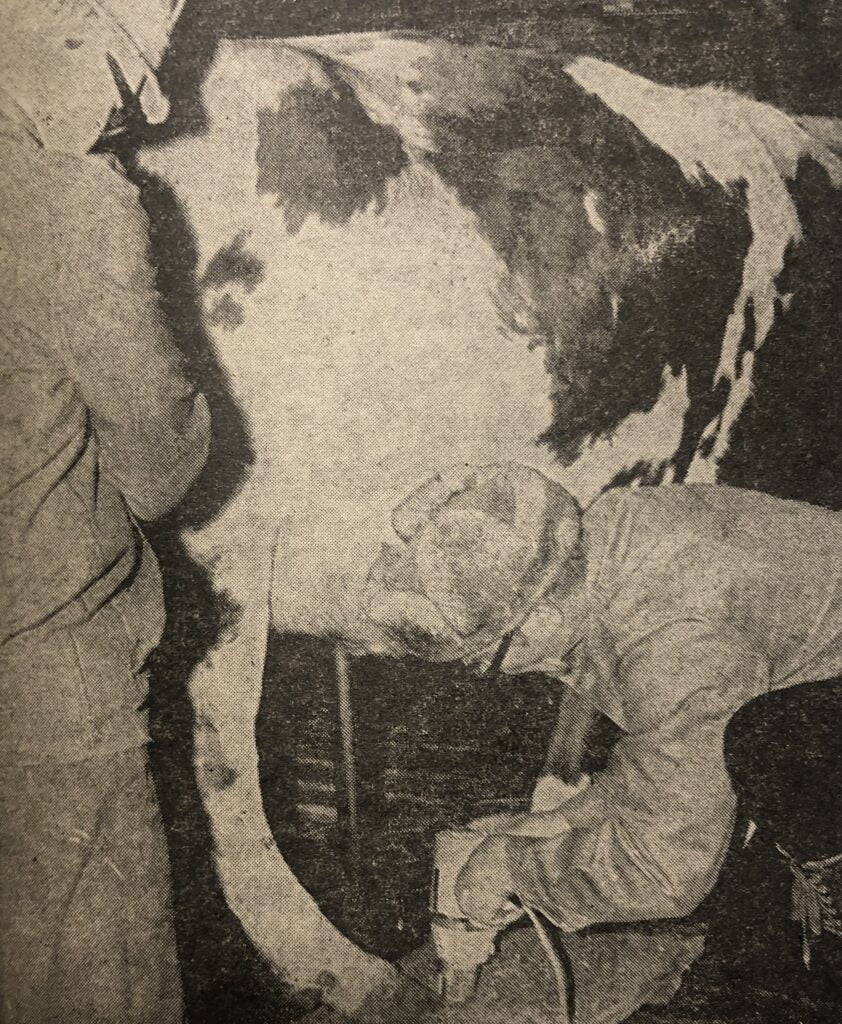 Lehmän sorkkien leikkaaminen on vähemmän hengenvaarallista kuin oriin kavioiden vuoleminen, totesi Ales Kämäräinen Erkki Kilvensalmelle. Kuva: Kiuruvesi-lehden arkisto