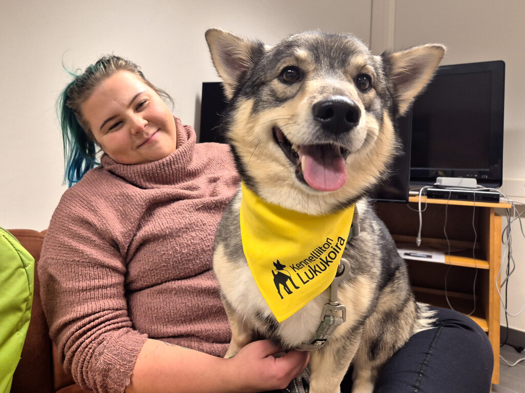 Lukukoira Ymir vieraili maanantaina ensimmäistä kertaa Kiuruveden kirjastolla…