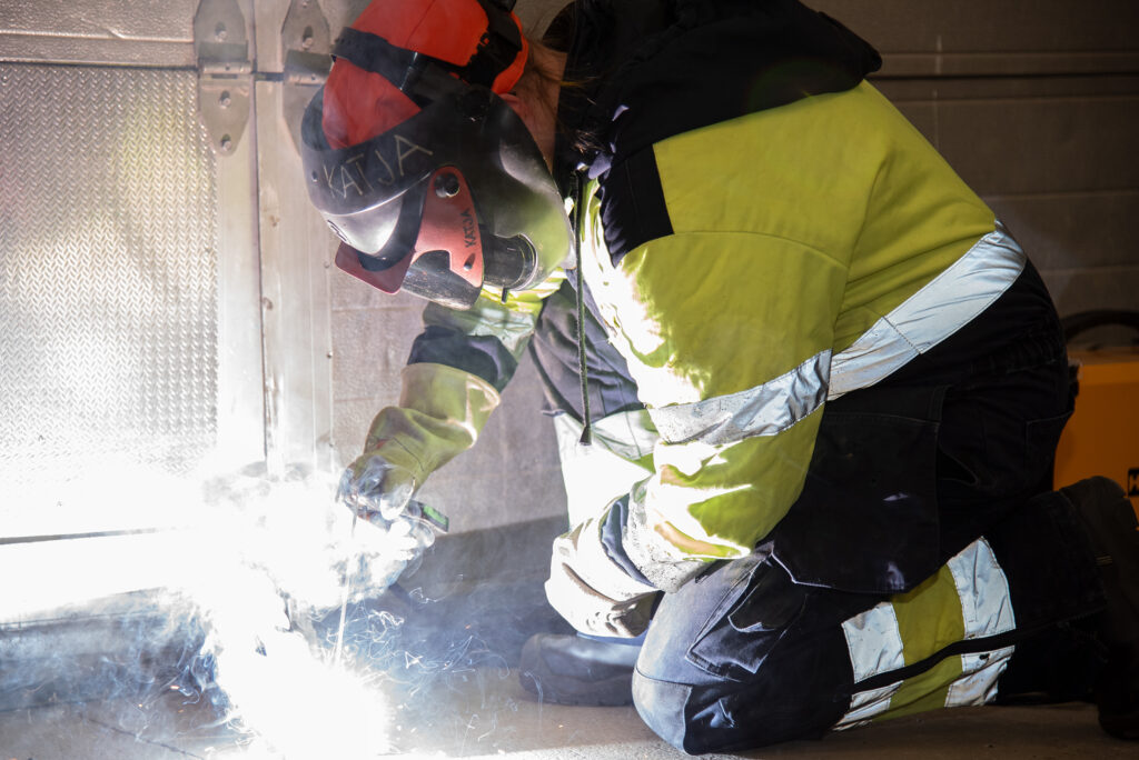 Hitsi-Pirkko eli Katja Vironen pitää työstään. Yrityksen nimi, Hitsi-Pirkko, tulee Virosen omasta lempinimestä, jonka työkaverit aikoinaan antoivat hänelle. Hän halusi antaa sen nimeksi yritykselleen, koska se on mieleenpainuva ja feminiininen. Virosen mukaan vain alle neljä prosenttia hitsaajista on naisia. Kuva: HANNA SOINI