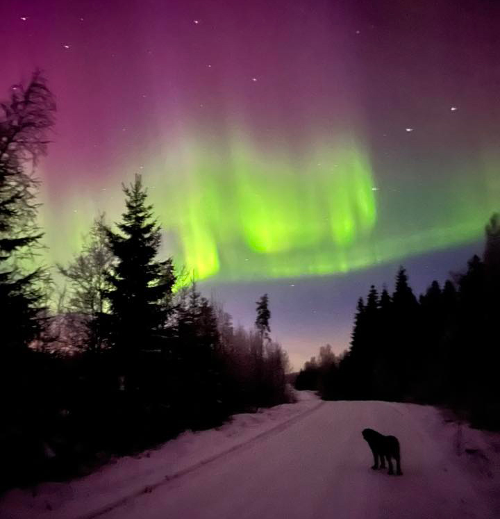 Revontulet loistivat Kiuruvedellä vihreän ja fuksianpunaisen sävyissä. Kuva: SANNA MANNINEN