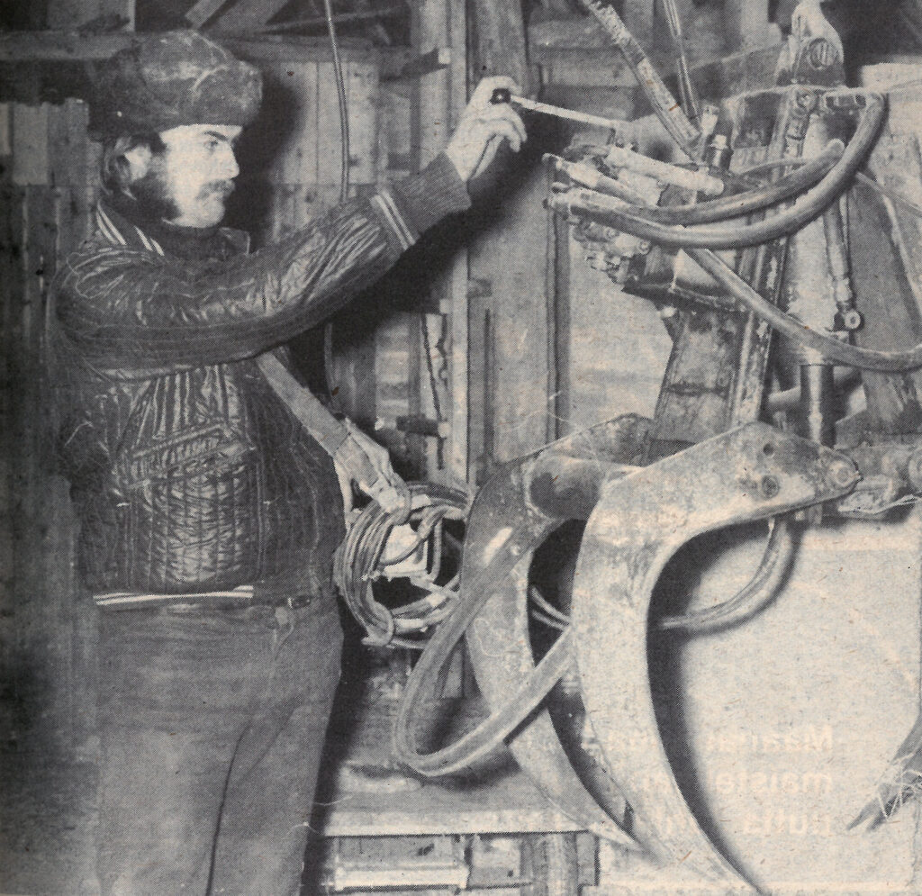 Pentti Remes totesi, että siltanosturin käsitteleminen on varsin nopeaa ja helppoa. Remeksellä on kainalossaan ohjauskeskus. Toisella kädellä voi käsitellä vaivattomasti kahmarin hallintavipua. Kuva: KIURUVESI-LEHTI