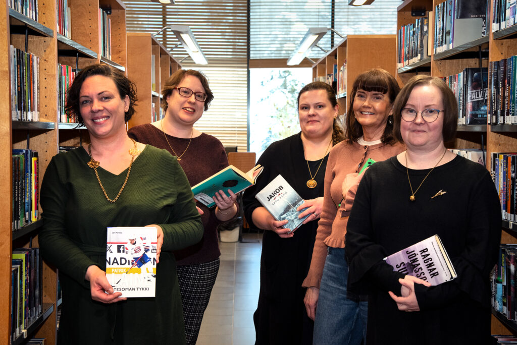 Kirjastosta lainataan kirjoja laidasta laitaan. Etenkin dekkarit ja elämäkerrat ovat suosittuja aikuisten puolella, kertovat kirjaston työntekijät Heidi Huhtilainen (vas.), Jenna Ruotsalainen, Anne Mansikkala, Anneli Knuutinen ja Mari Kukkonen. Kuva: HANNA SOINI