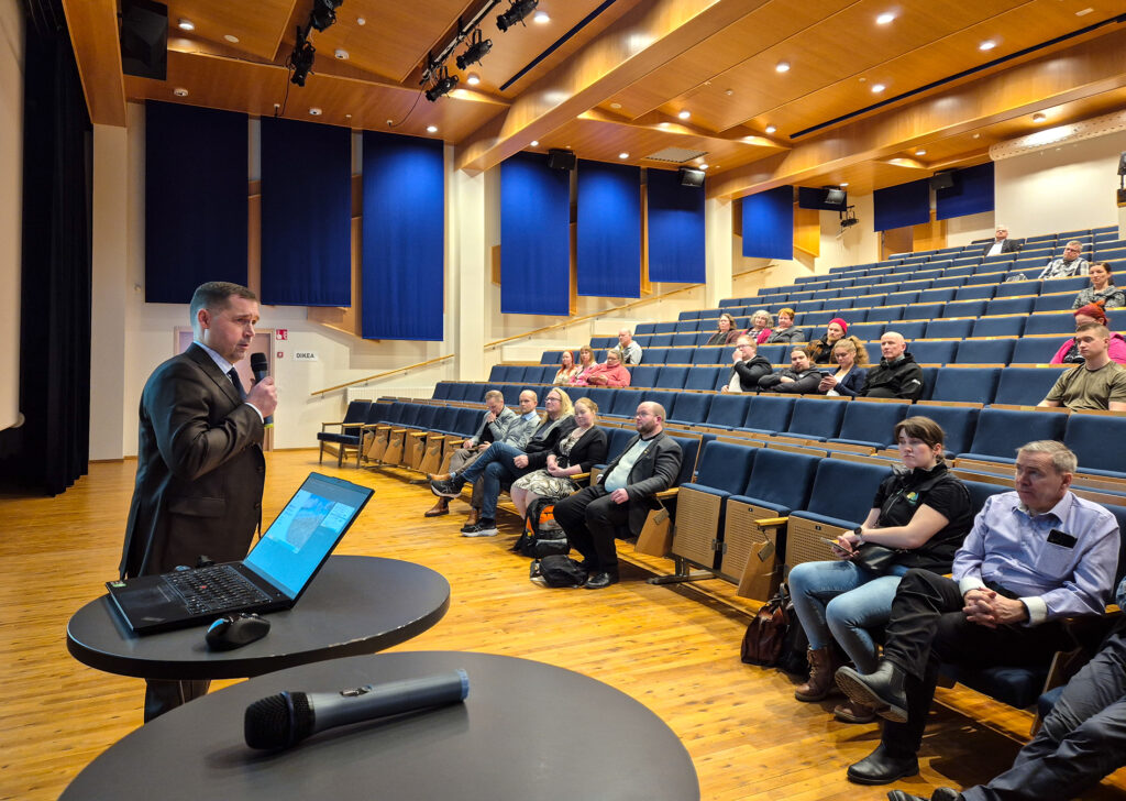 Tero Hemmilä puhui Kiurusalissa muun muassa maatalouteen liittyvästä politiikasta ja lainsäädännöstä. Tilaisuuden lopuksi yleisö sai esittää kysymyksiä. Kuva: HANNA SOINI