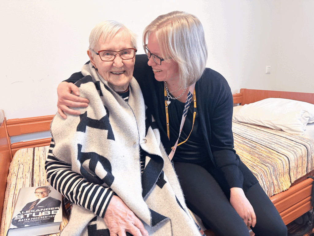 Elvi Pennanen viihtyy hyvin Kallionsydämessä, vieressä Kallionsydämen palveluesihenkilö Anna-Riikka Timlin. Kuva: JAANA SELANDER